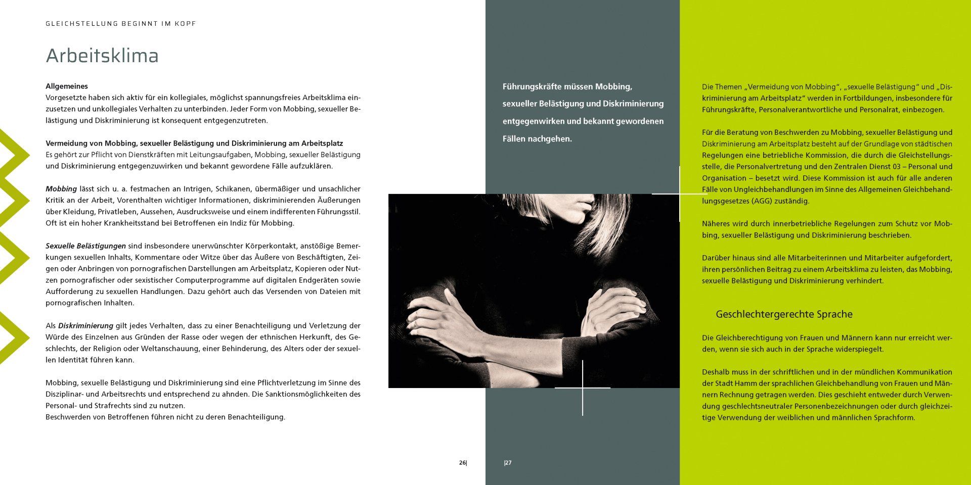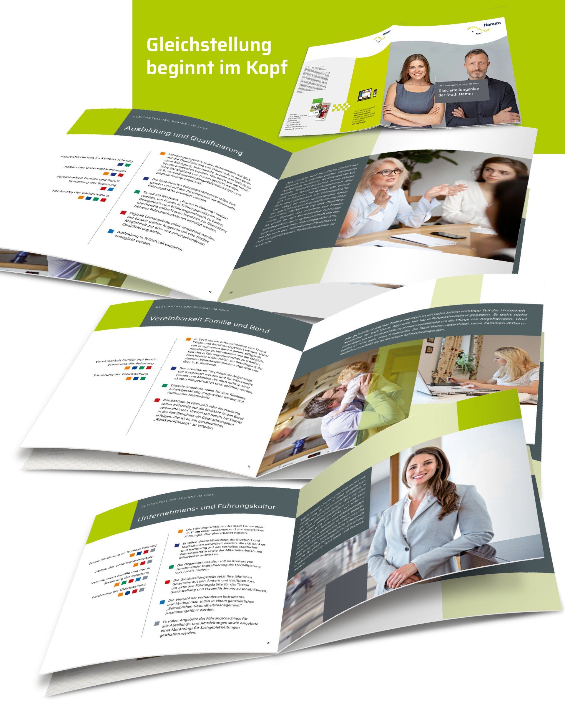 Aufgabenstellung: Wie heißt es in der Broschüre: Gleichwertige Teilhabe von Frauen und Männern auf allen Hierarchiestufen. Die Stadt Hamm als fortschrittliche Kommune hat sich zum Ziel gesetzt, den Worten Taten folgen zu lassen. Und in zwei Info-Broschüren zu dokumentieren.